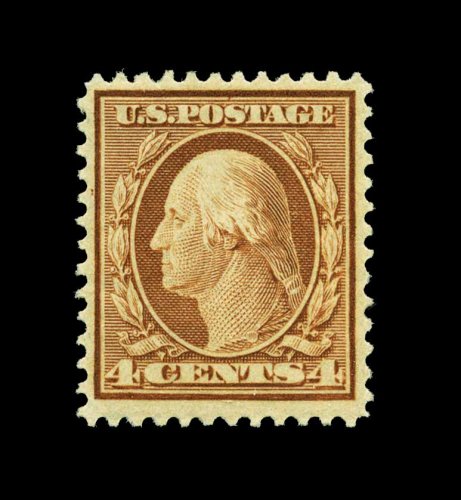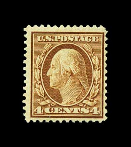 493 og 360 image#360, 4c Orange brown on bluish paper, rich luxuriant color and a well incised impression, attractively centered, disturbed o.g., very fine. A large number of the approximately 90 examples of the Four Cent Bluish Paper released to the public are found centered to right - often quite severely with their perforations just clearing or cutting the design. This particular example, while centered a bit to right as usual, is well clear of the design and possesses a handsome overall appearance. A stamp that is missing in even the most advanced collections of United States stamps. Accompanied by a 1982 PF certificate. (Image) 24,000.00