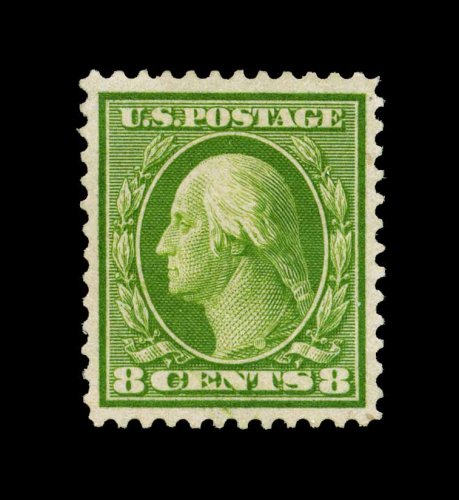 497 og 363 image#363, 8c Olive green on bluish paper, magnificently well centered amid margins that are uncharacteristically large, gorgeous intense color and a strong impression on bright paper, minute natural inclusion in right margin barely discernible, full o.g., lightly hinged, extremely fine. Of the fewer than 90 examples that exist in private hands, this superlative copy from the Lessin collection is one of the very finest. As the vast majority of these are found off center, the centering of this particular copy stands out as one of its most impressive attributes. But just as impressive are this stamp's lavishly large margins and exceptionally rich color. A rare opportunity to acquire one of the great 20th century rarities in premium condition. Accompanied by a 1961 PF certificate. (Image) 26,000.00