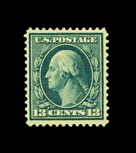 500 og 365 image#365, 13c Blue green on bluish paper, extraordinarily fresh and crisp, with lovely rich color and a razor-sharp impression on bright paper, exceptionally well centered and margined, full clean o.g., lightly hinged, extremely fine; a particularly handsome Thirteen Cent Bluish Paper; 1995 PF certificate. (Image) 3,000.00