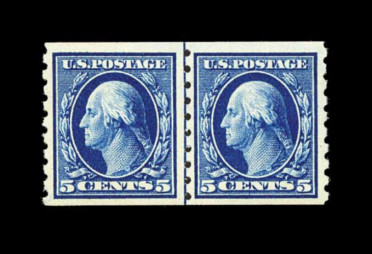 #396, 5c Blue coil, perf. 8 1/2 vert., guide line
