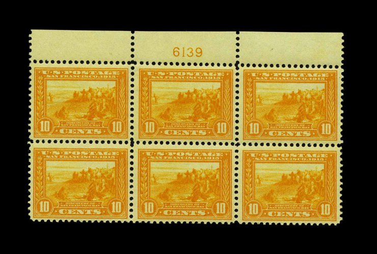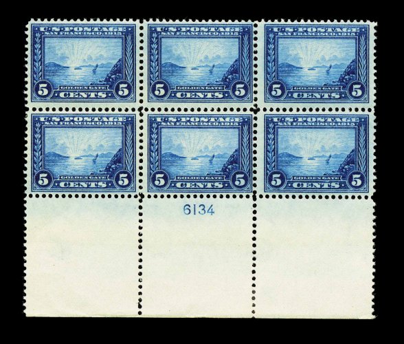extraordinarily handsome and choice top margin plate no. 6139 block of six,