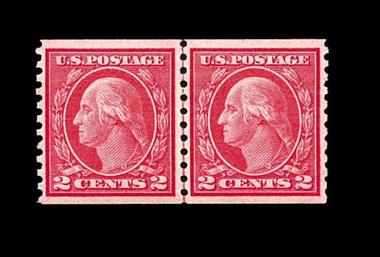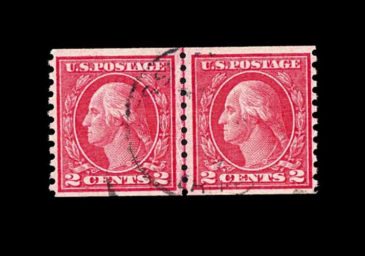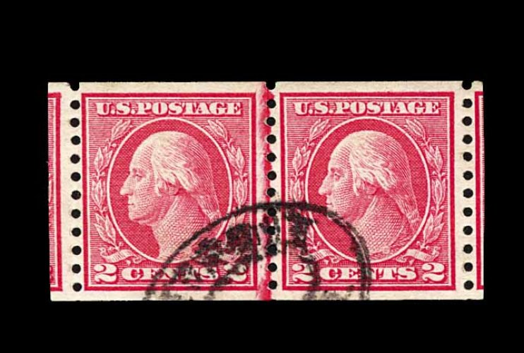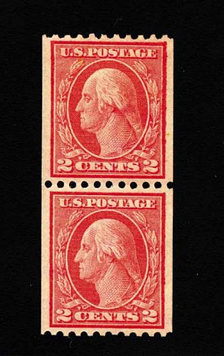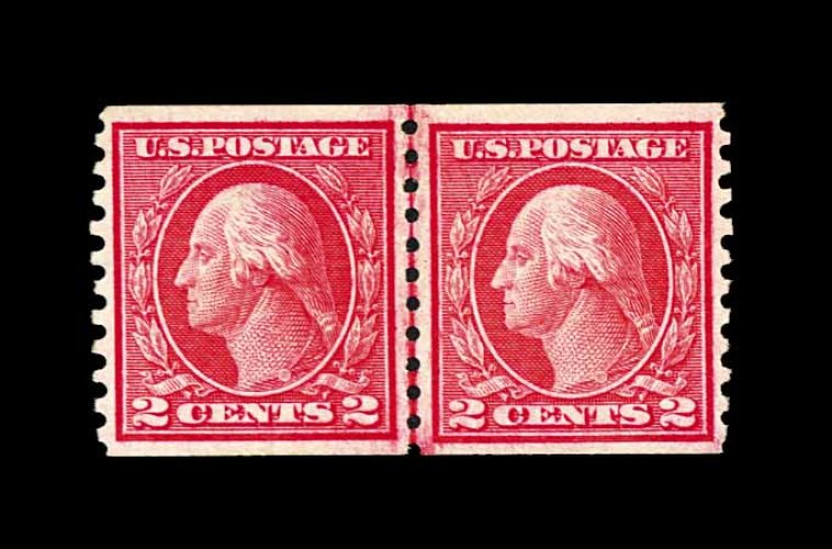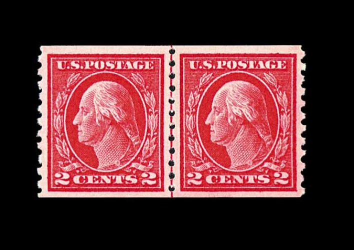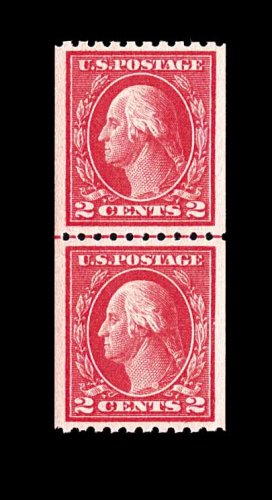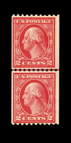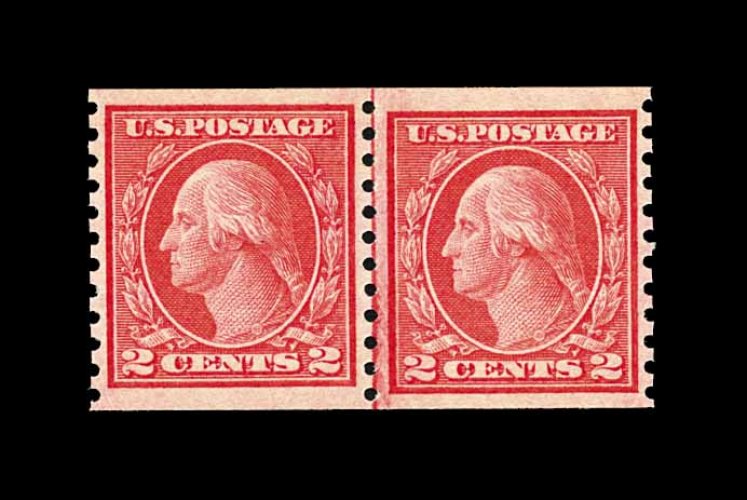 573 nh 449 image#449, 2c Red rotary coil, Ty. I, perf. 10 horiz., a choice joint line pair, wonderfully fresh and crisp overall, with rich characteristic red color and a razor-sharp impression on bright paper, quite well centered, particularly between the stamps which is especially difficult to find, even the joint line is far more crisply and cleanly printed than usual, immaculate o.g., never hinged, very fine; the rarity of the Two Cent Ty. I rotary plate coil is the result of its very limited lifespan, having been issued in December 1915, only to have been replaced by the Type III design in February 1916. Additionally, its release was virtually unnoticed by philatelists at the time and very few were saved. A wonderfully choice example of this coil rarity, being among the very few that exist in this pristine never hinged condition; 1982 PF certificate. (Image) 26,000.00