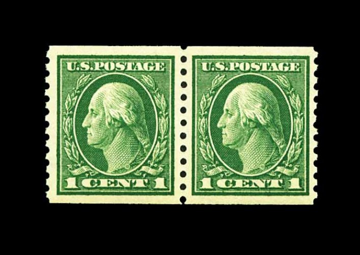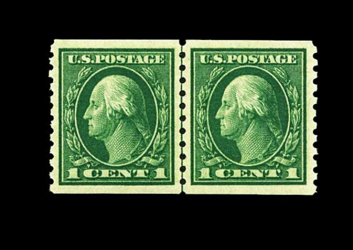 564 nh 443 image#443, 1c Green flat plate coil, perf. 10 vert., pair, well centered within exceptionally large margins, deep luxuriant color, o.g., n.h., extremely fine; 1999 PF certificate. (Image) 135.00
