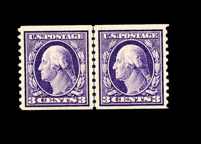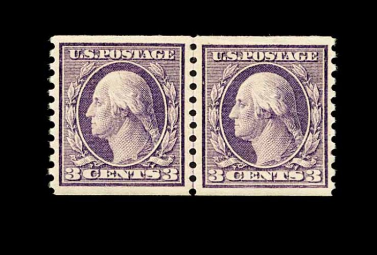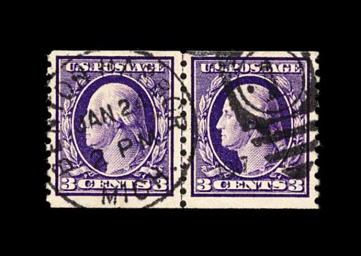 568 O 445 image#445, 3c Violet flat plate coil, perf. 10 vert., a fabulous quality used guide line pair, marvelously well centered within large margins, strikingly intense color and impression on fresh paper, superbly postmarked with a "Benton Harbor, Mich.Jan 2, 1917" duplex, extremely fine; easily one of the finest of the very few certified used line pairs of Scott #445 in existence; 1987 PF certificate. (Image) 2,000.00