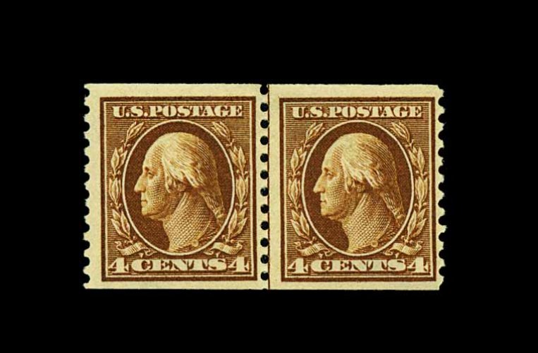 569 og 446 image#446, 4c Brown flat plate coil, perf. 10 vert., guide line pair, rich color, attractively centered, o.g., lightly hinged, right stamp with faint thin speck not mentioned on accompanying certificate, otherwise fine-very fine; clear 1994 PF certificate. (Image) 750.00