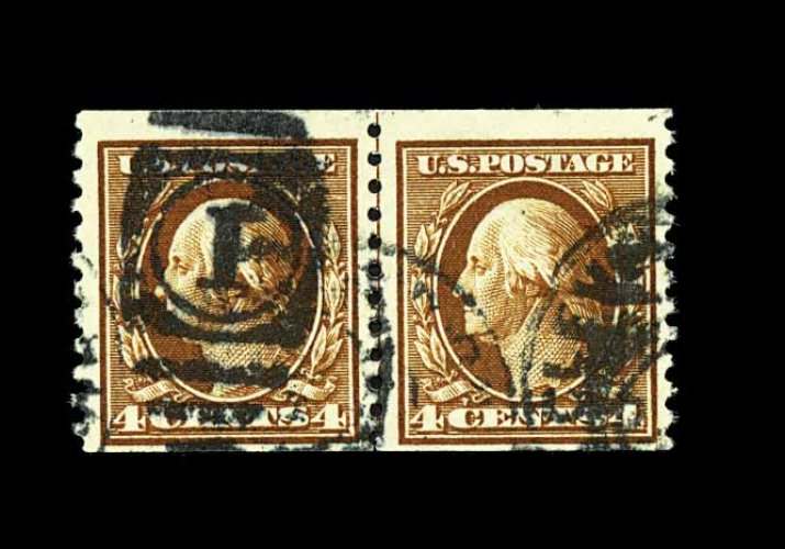 570 O 446 image#446, 4c Brown flat plate coil, perf. 10 vert., guide line pair, used, strong rich color, nicely centered, bold duplex cancel, very fine for this exceedingly scarce used line pair, being one of the few used line pairs of this which exists without any faults; 1997 PF certificate. (Image) 750.00