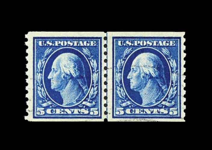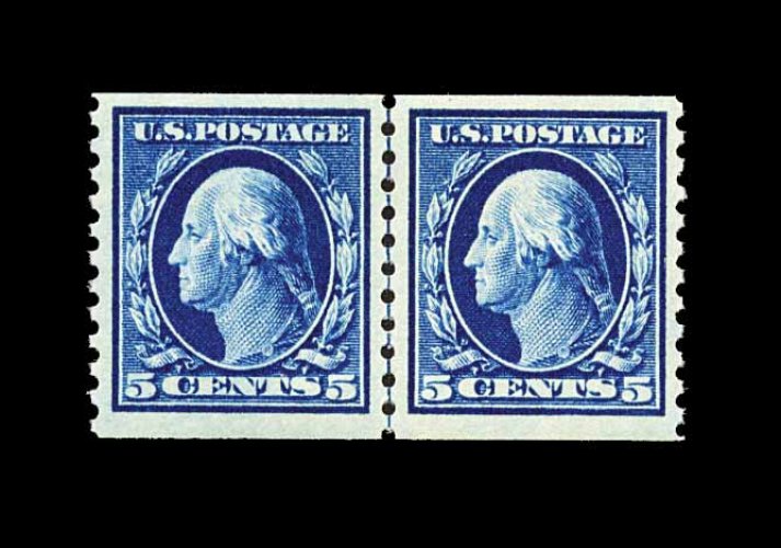 571 og 447 image#447, 5c Blue flat plate coil, perf. 10 vert., guide line pair, large well balanced margins, strikingly intense color and impression, o.g., lightly hinged, extremely fine; a gem line pair; 1990 PF certificate. (Image) 260.00