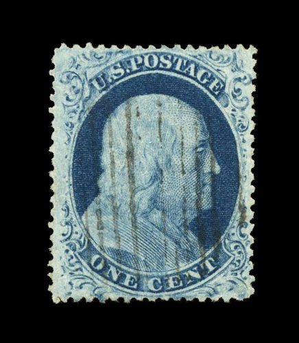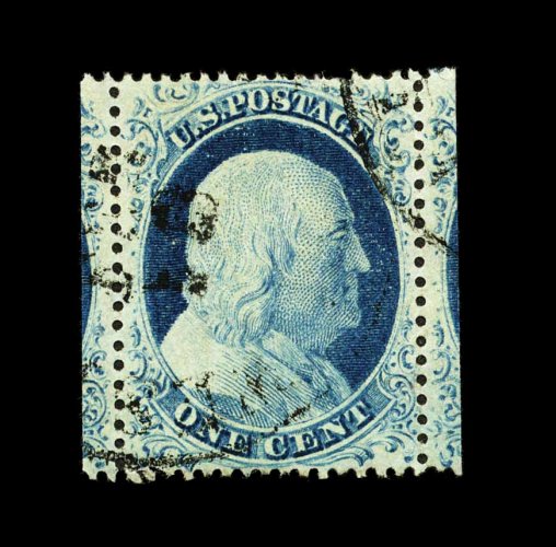 44 O 23 image#23, 1c Blue, Ty. IV, a magnificent used example of this challenging stamp, being among the finest quality examples we have ever encountered, cut from a strip so that equal portions of the adjoining stamps at sides still remain, absolutely perfect centering which is virtually unheard of, bright rich color and an especially clean impression, very light and unobtrusive town c.d.s., an extremely fine gem in every regard; a true condition rarity as Plate 1 perforated stamps are notoriously difficult to find in premium condition; 1993 PF certificate. (Image) 700.00