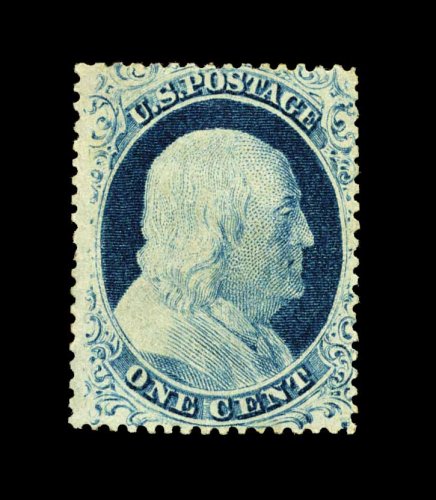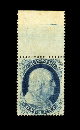 45 og 24 image#24, 1c Blue, Ty. V, gem top sheet-margin mint single, incredibly well centered and margined, intense color in an unusually deep shade, full o.g., lightly hinged, extremely fine and quite handsome. (Image) 175.00
