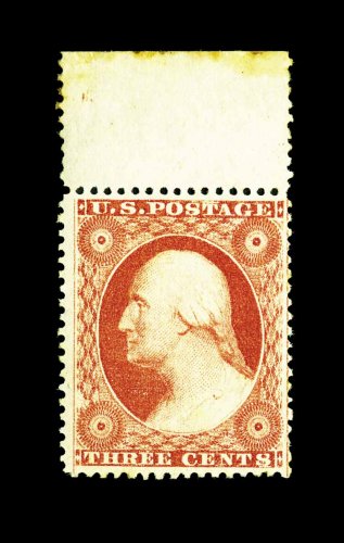 47 nh 26 image#26, 3c Dull red, Ty. II, brilliantly fresh top sheet-margin single, gorgeous intense color and a well defined impression on bright crisp paper, attractively centered, pristine o.g., never hinged, very fine. (Image) for hinged 75.00