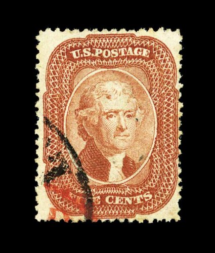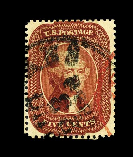 53 O 28A image#28A, 5c Indian red, Ty. I, an especially attractive and colorful used example of this rare shade, possessing especially deep and luxuriant color, strong well incised impression, far better centered than the majority of examples one encounters, black town c.d.s. along with a portion of a red transit c.d.s., very fine and quite choice; 1995 PF certificate. (Image) 3,075.00