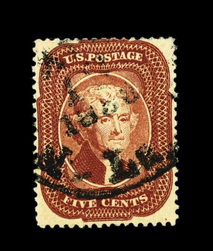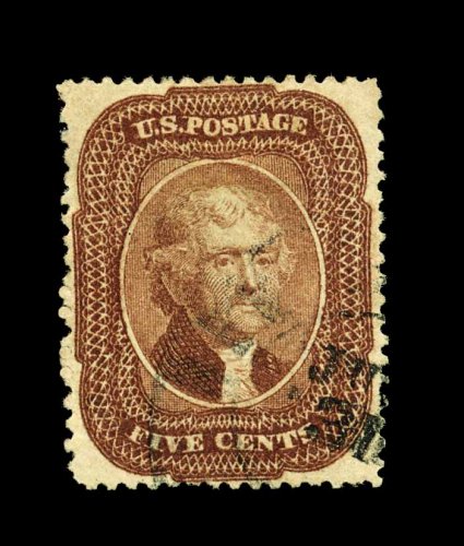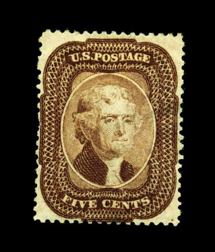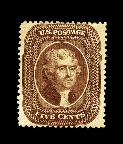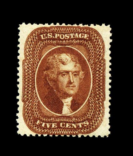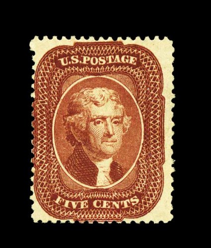 59 og 30A image#30A, 5c Brown, Ty. II, a magnificently choice mint example, possessing numerous exceptional overall physical qualities, not the least of which is its fabulous overall brilliance, with truly prooflike color and impression on immaculate paper, plus it is virtually perfectly centered within uncharacteristically large margins, its reverse sports full pristine o.g. with just the barest trace of hinging, extremely fine; few examples of the 1860 Five Cent Type II exist in this gem quality, especially still retaining their full original gum; 1996 PF certificate. (Image) 1,900.00