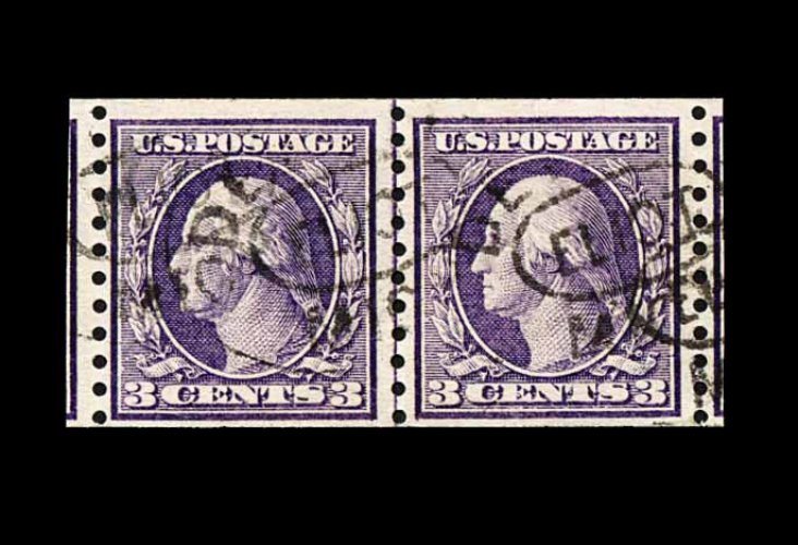 581 O 456 image#456, 3c Violet rotary coil, Ty. I, perf. 10 vert., a very rare and desirable used joint line pair, cut from a line strip of four so that portions of the adjoining stamps appear at each end, vibrant color and impression on bright fresh paper, nicely centered, very light and unobtrusive double oval postmarks, very fine; few certified used line pairs exist; 1988 PF certificate for a line strip of four from which this pair was taken. (Image) 1,200.00