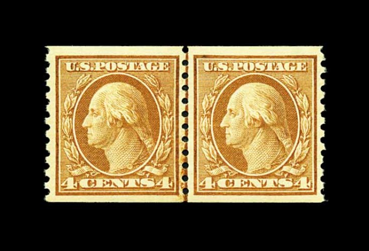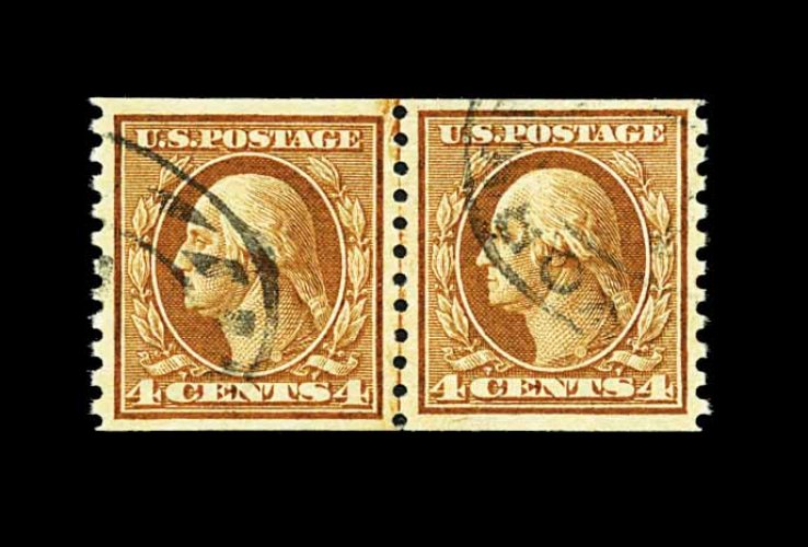 583 O 457 image#457, 4c Brown rotary coil, perf. 10 vert., gem used joint line pair, incredibly well centered, large margins, deep rich color on bright paper, especially light and unobtrusive New York registry ovals, extremely fine; incredible quality for this elusive used line pair; 1997 PF certificate. (Image) 140.00