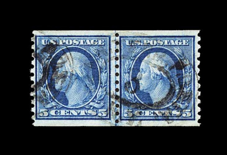 584 O 458 image#458, 5c Blue rotary coil, perf. 10 vert., a very scarce used joint line pair in the finest condition imaginable, featuring absolutely flawless centering amid lavishly large margins, sumptuously rich color and a well incised impression on bright paper, very light and unobtrusive New York double oval registry postmarks, superb; we cannot imagine that finer used line pair of this exists; 1999 PF certificate. (Image) 140.00