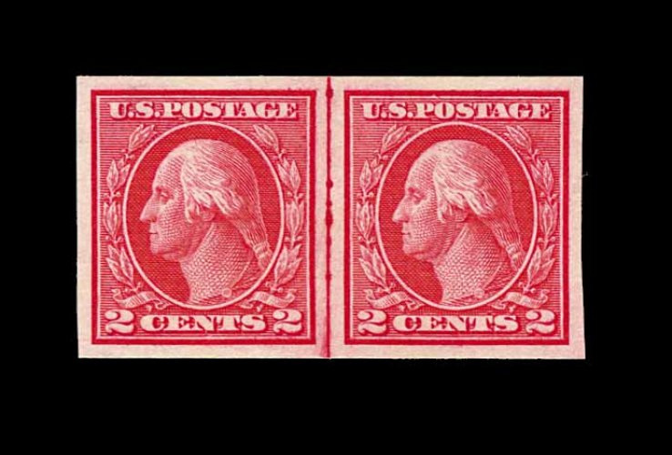 587 nh 459 image#459, 2c Carmine imperforate coil, a gem example of this very scarce joint line pair, without the usual crease between the stamps, incredibly fresh, with absolutely gorgeous intense color and impression, four large and wonderfully well balanced margins, pristine o.g., n.h., extremely fine; uncreased examples of this line pair are especially elusive and desirable in this premium quality; the catalog value quoted in Scott is for a line pair with the usual crease; 2001 PF certificate. (Image) 1,600.00+