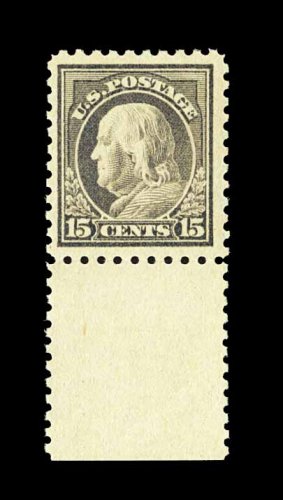 599 nh 475 image#475, 15c Gray, impressive bottom sheet-margin mint single, extraordinarily large margins and quite well centered within them, considerably deeper color and impression than usual on bright paper, o.g., n.h., choice very fine; 1989 PF certificate. (Image) 360.00