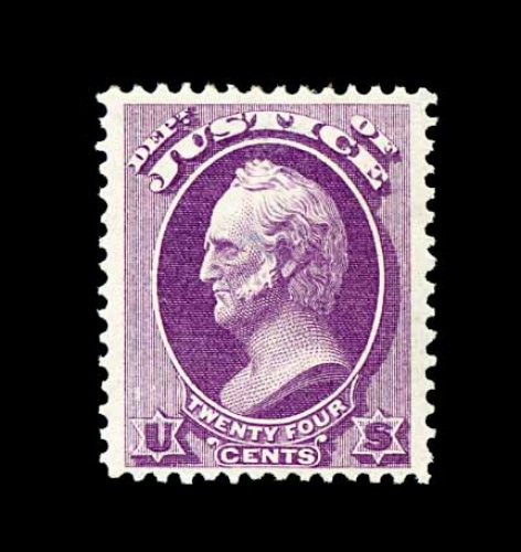 743 og O32 image#O32, 24c Justice, a particularly choice mint example of this very scarce and terribly difficult value, possessing an overall freshness not often seen, prooflike color and impression on bright paper, quite well centered within uncharacteristically wide margins, full clean o.g. that has been only very lightly hinged, very fine; 1991 PF certificate. (Image) 875.00