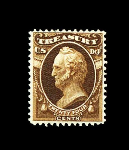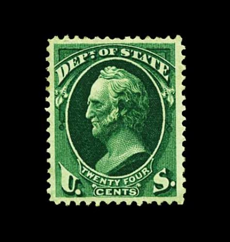 752 og O65 image#O65, 24c State, an exceedingly handsome mint example, featuring outstanding centering amid unusually large margins, sumptuously rich color and impression, full clean o.g., lightly hinged, extremely fine; an especially scarce stamp in such choice quality; 1997 PF certificate. (Image) 450.00