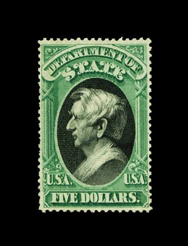 754 ng O69 image#O69, $5.00 State, an extraordinarily well centered unused example of this rare value, prooflike colors and impressions on bright paper, very fine; this stamp is seldom seen so well centered; 1997 PF certificate. (Image) 6,000.00