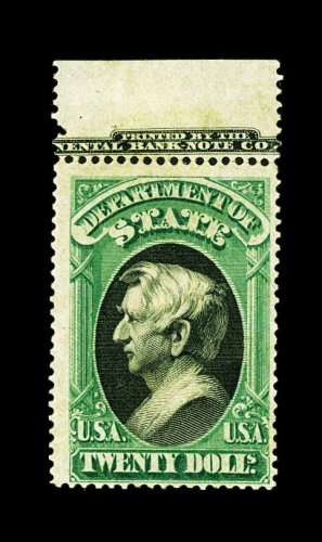 756 og O71 image#O71, $20.00 State, handsome top margin partial imprint mint single, particularly fresh, rich colors and strong impressions, rather well centered, full clean o.g. that has been lightly hinged, selvage a bit weak from having been once folded over, very fine; a difficult stamp to find in any kind of acceptable quality; 1979 PF certificate. (Image) 3,250.00