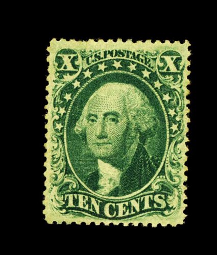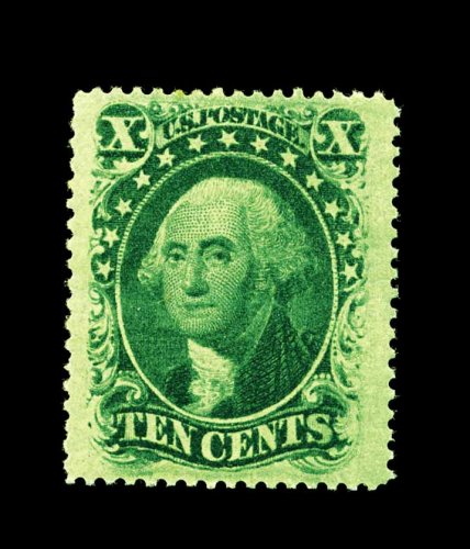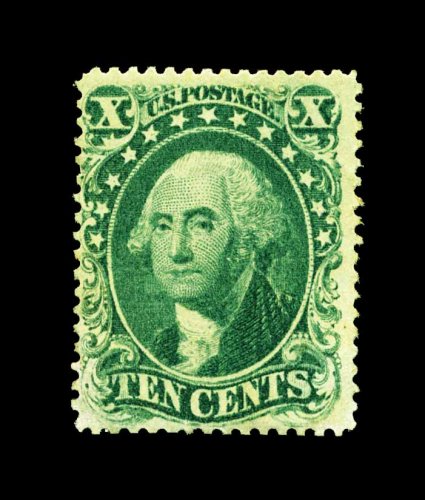 64 og 32 image#32, 10c Green, Ty. II, an exceptionally rare and seldom offered mint example, with bright color and a detailed impression, fairly well centered, full o.g., minor h.r., just the faintest trace of a horizontal crease at top (more accurately described as a bend), fine; certified original gum examples of this stamp are quite elusive; 1996 PF certificate. (Image) 5,000.00