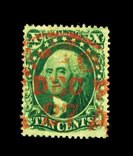 67 O 33 image#33, 10c Green, Ty. III, used, wonderfully well centered within large margins, sumptuously rich color and a deeply etched impression, both of which are spectacularly contrasted by a gorgeous red New York town c.d.s. that is centrally and cleanly struck, extremely fine overall; a stamp with fabulous eye appeal; 1990 PF certificate. (Image) 305.00