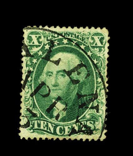 65 O 32 image#32, 10c Green, Ty. II, an absolutely stunning used example, possessing both the finest centering and largest margins we have ever encountered on this stamp, being flawlessly centered amid extravagantly wide margins which are most uncharacteristic of the issue, plus its color is especially bright and vibrant, crisp impression on bright paper, superbly postmarked with a light central strike of a double oval town postmark, an extremely fine gem for the perfectionist; 1993 PF certificate. (Image) 275.00