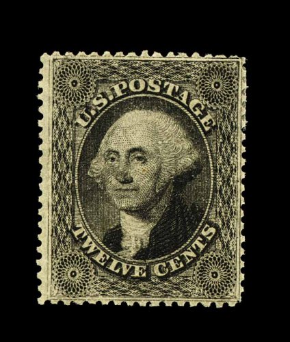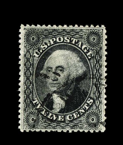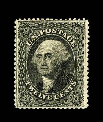 70 og 36 image#36, 12c Black, plate I, incredibly well centered for this issue, strikingly intense color and a prooflike impression on brilliantly fresh and crisp paper, full clean o.g., lightly hinged, extremely fine; a notoriously difficult stamp to find not only this well centered, but this choice as well; 1993 PF certificate. (Image) 1,300.00