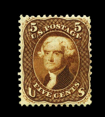 100 og 57 image#57, 5c Brown "August", a wonderfully fresh original gum example of this challenging and important rarity, featuring sumptuously rich and intense color, plus its impression is razor-sharp on crisp paper, rather well centered, redistributed o.g., single perforation tip added at top left, accompanying certificate also states "small stains removed" which we find so minor that it is almost impossible to detect, otherwise very fine; only 35 examples of the Five Cent "August" issue are known (two of which are cancelled) and only 16 of the existing population still retain any portion of their original gum; this value is notorious for being found with varying degrees of faults, in fact, none of the recorded original gum examples are completely sound; a highly collectable example of this extremely rare stamp; 1998 PF certificate. (Image) 14,000.00