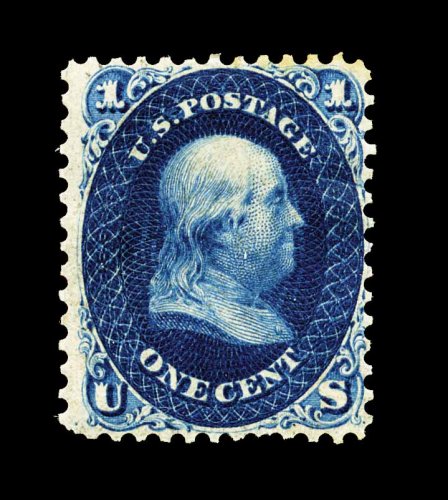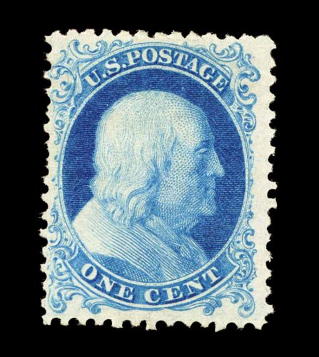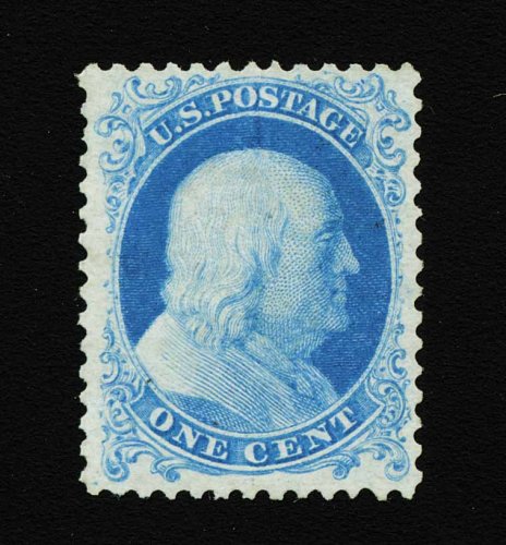 97 og 55 image#55, 1c Indigo "August", full clean original gum, lightly hinged, fabulously fresh and crisp, with intense characteristic "August" color, extraordinarily well centered, especially when compared to other known examples, as most are found more strongly centered to the top, single slightly nibbed perforation at bottom mentioned for accuracy only, very fine and wonderfully choice. It is believed that a total of 24 copies exist of the One Cent First Design or so-called "August" Issue. Of this total, two are cancelled and another is housed in the New York Public Library collection, leaving only 21 uncancelled copies available to collectors. More than half of the available examples are found either with faults, without gum, or both. In fact, there are only eight that exist which are sound and still retain their original gum, with the Lessin example being among this elite group. An exciting opportunity to acquire a premium quality original gum example of one of the rarest stamps in United States philately. Accompanied by a 1989 PF certificate. (Image) 20,000.00