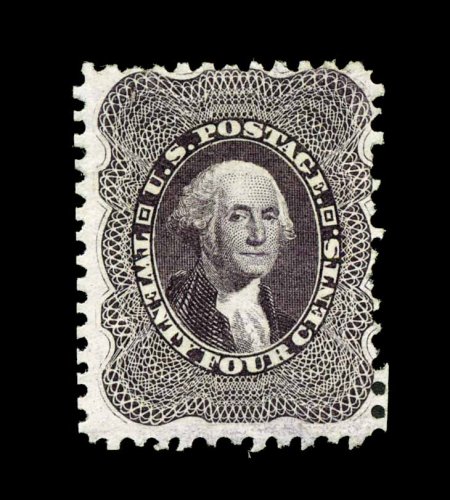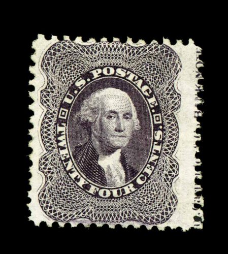 91 og 45 image#45, 24c Blackish violet reprint, without gum as issued, an extraordinarily choice example of this value, possessing exceptional centering within large margins, the margins at sides are particularly wide (so wide, in fact, that a large portion of the imprint appears at right), even its color and impression are out of the ordinary, being truly prooflike on bright fresh paper, extremely fine; among the finest available of the 479 issued; 1976 PF certificate. (Image) 3,250.00