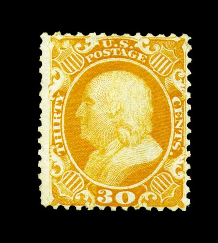 93 og 46 image#46, 30c Yellow orange reprint, without gum as issued, an incredibly select example of this reprint rarity, possessing outstanding centering amid extravagantly large margins which are most uncharacteristic, with its perforations clearing the design all around which, in our opinion, occurs on probably less than 10% of the 480 issued, radiantly rich color, extremely fine; a handsome stamp; 1974 and 1989 PF certificates. (Image) 3,250.00