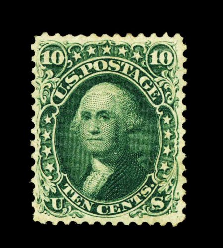 101 og 58 image#58 (or #62B), 10c Dark green "August", an incredibly fresh and desirable mint example, possessing a remarkable overall brilliance and crispness, with gloriously rich color and a razor-sharp impression, while centered just a bit to bottom, this stamp is far better centered and margined than usual, pristine full o.g., lightly hinged, very fine; a marvelously choice example of a stamp that is terribly challenging to find in such premium condition and still retaining its full original gum; 1971 PF certificate. (Image) 6,750.00