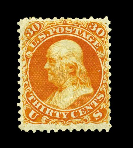 105 og 61 image#61, 30c Red orange "August", full clean original gum, fabulously bright and crisp, featuring spectacular eye-arresting color in a very deep shade, wonderfully well centered and margined, with its perforations clearing the design all around, which is exceedingly difficult to find on this tightly spaced stamp, completely free of any of the flaws which affect most known examples, extremely fine. There are only 28 certified examples of Scott #61 found in the Philatelic Foundation records, plus there is an additional uncertified example in the New York Public Library collection. One common characteristic of the Thirty Cent "August" is the presence of creasing due to the brittle nature of the paper. In many cases this creasing is severe and is an accepted condition factor for serious collectors attempting to assemble a complete set of "August" issues. To find one without this characteristic creasing is extraordinary. To then find one still retaining its full original gum and possessing outstanding centering is a virtually unique opportunity. A superlative example of this important rarity. Ranking as one of the very finest Thirty Cent "August" issues in existence. Accompanied by a 1970 PF certificate. (Image) 17,500.00