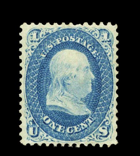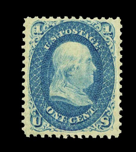108 og 63 image#63, 1c Blue, well centered amid extraordinarily large margins, lovely rich color and a deeply etched impression, full clean o.g. with just the barest suggestion of a hinge mark (if at all), minor diagonal gum bend of little importance, very fine; a particularly fresh and choice stamp; clear 1985 PF certificate. (Image) 325.00