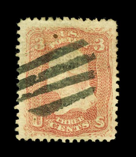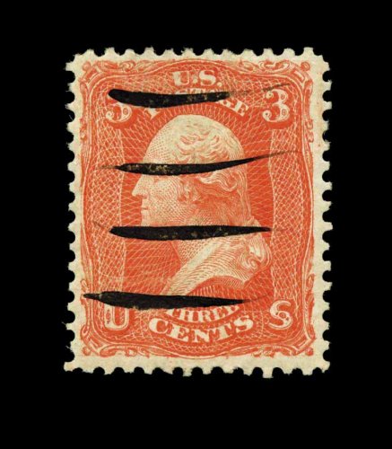 142 O 74 image#74, 3c Scarlet, an exceptional used example of this trial printing rarity, characteristic four stroke pen cancel, being among the finest quality examples in existence, outstanding centering within very large margins, gloriously intense color and a razor-sharp impression on bright paper, fully intact perforations all around, even still retaining a small part of its original gum, extremely fine; very few examples of the Three Cent Scarlet exist, whether mint or used, and despite the disparity in catalog value we believe the used examples are far more elusive than mint copies; the used examples with pen strokes are thought to come from a supply of Three Cent Scarlet stamps obtained by the Washington, D.C. stamp dealer Carl F. Rothfuchs in 1893; 1991 PF certificate; ex-Lyons. (Image) 5,000.00