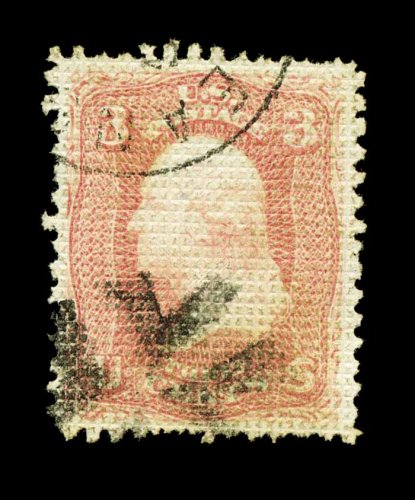 154 O 79 image#79, 3c Rose, "A" grill, a remarkable quality example of this very scarce stamp, being in a condition that is far superior to most existing examples, possessing near perfect centering within uncharacteristically large margins, additionally its color is far brighter and its impression more intense than usual on bright fresh paper, beautifully cancelled with a neat light town c.d.s. and duplex crossroads postmark, while this stamp has the customary irregular perforations due to the all-over grill, they are much more intact than usual, one of the few used examples of a Three Cent "A" Grill that is truly extremely fine; 1995 PF certificate. (Image) 1,100.00