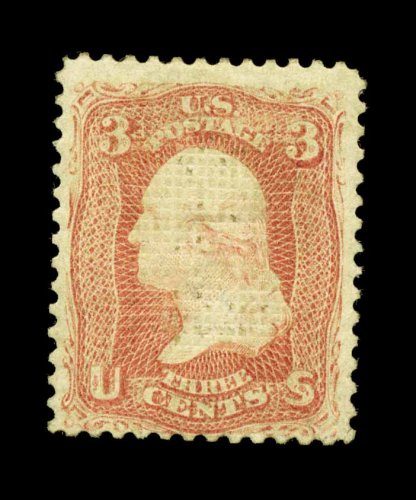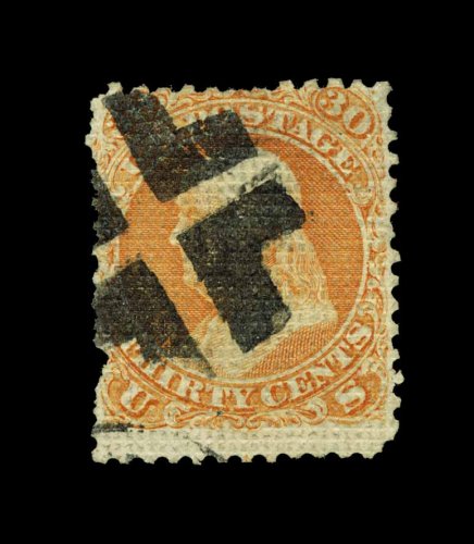 155 O 81 image#81, 30c Orange, "A" grill, used, deep luxuriant color, bold perfectly struck crossroads postmark, centered just slightly to top right as are all known examples, characteristic irregular perforations of the experimental all-over "A" grill, small tear in right margin, fine. With only eight Thirty Cent "A" Grill stamps recorded, all of which are used, this stamp ranks as one of the greatest classic rarities in United States philately. One of the eight is housed in the New York Public Library's collection and, in all likelihood, will never be available to collectors. All possess virtually the same centering and are cancelled quite similarly to the example offered here, although the strike of this cancel is particularly choice. As is widely documented, the all-over nature of the experimental "A" grills found on the enormously rare Five Cent and Thirty Cent values cause irregular perforations on virtually all known copies. Of the seven Thirty Cent "A" grills potentially available to collectors, six have missing or pulled perforations similar to the Lessin example and most have faults that are considerably more severe. A virtual once-in-a-lifetime opportunity to acquire one of the great rarities in all of philately. This exciting stamp has graced several of the most important United States collections ever formed, including the Worthington, Hind and Isleham collections. The footnote in Scott for both Scott #80 and #81 reads "All are more or less faulty and/or off center. Values are for off-center examples with small perforation faults." Accompanied by a 1986 PF certificate. (Image) 60,000.00