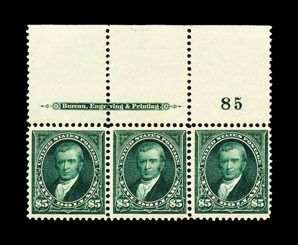 265 og/nh 278 image#278, $5.00 Dark green, an incredibly choice and handsome full top margin imprint and plate no. 85 strip of three, possessing a remarkable overall freshness and brilliance, with fabulously intense color and impression on bright fresh paper, quite well centered and margined throughout, pristine full o.g., center stamp with a single very light hinge mark, while both end stamps are never hinged, very fine; a select example of this extraordinarily rare and desirable plate number strip; cataloged as two never hinged singles and one hinged single (catalogs $9,750.00 as a hinged plate number strip); 1991 PF certificate. (Image) as three singls 12,400.00