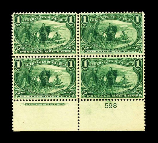 271 nhX 285 image#285, 1c Trans-Mississippi, full bottom imprint and plate no. 598 block of four, strong rich color, o.g., n.h., very fine. (Image) 325.00
