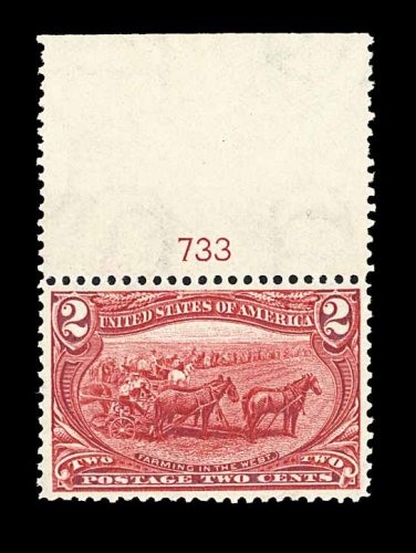272 nh 286 image#286, 2c Trans-Mississippi, top margin plate no. 733 single, excellent centering, brilliantly rich color, o.g., n.h., extremely fine; 2002 PF certificate. (Image) 55.00