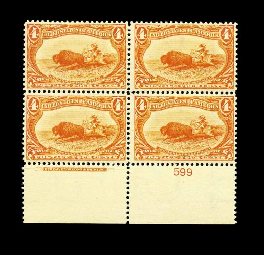 274 nhX 287 image#287, 4c Trans-Mississippi, full bottom imprint and plate no. 599 block of four, gorgeous radiant color, unblemished o.g., n.h., very fine and quite attractive. (Image) 1,500.00