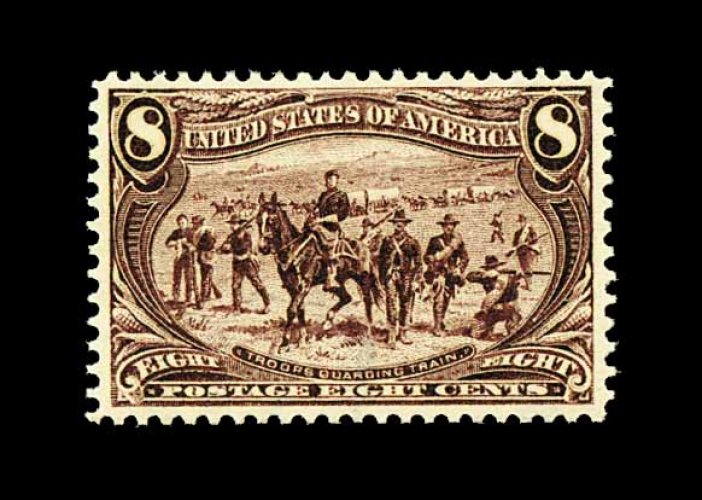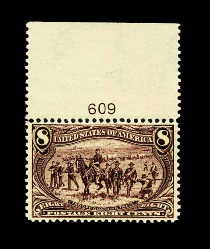 278 nh 289 image#289, 8c Trans-Mississippi, handsome top sheet-margin plate no. 609 single, deep intense color and a prooflike impression, excellent centering as well, o.g., n.h., extremely fine; 2001 PF certificate for a pair, this being the right stamp. (Image) 360.00