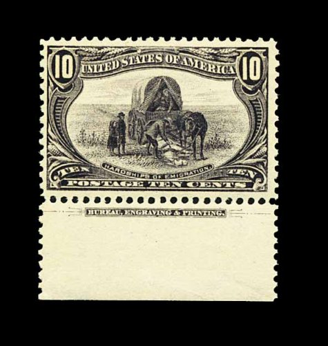280 og 290 image#290, 10c Trans-Mississippi, bottom sheet-margin imprint single, sumptuously rich color and a strong impression, nicely centered, o.g., lightly hinged, choice very fine; 2001 PF certificate for a pair, this being the left stamp. (Image) 180.00