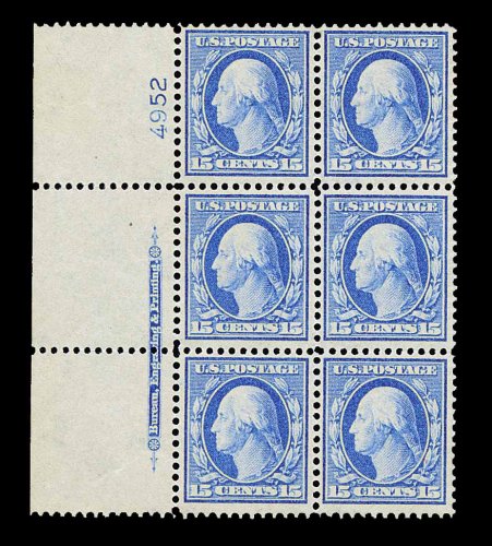 363 ogX 366 image#366, 15c Pale ultramarine on bluish paper, an extremely rare and desirable full left sheet-margin imprint and plate no. 4952 block of six, being marvelously well centered for any bluish paper plate block, let alone this difficult value, and possessing much stronger color and impression than usual, extraordinarily fresh and crisp, full clean o.g., the bottom four stamps are n.h., top stamps lightly hinged, overall extremely fine; one of just a few known plate blocks of the Fifteen Cent Bluish Paper, and fewer still have full sheet selvage; 1996 PF certificate. (Image) 11,000.00