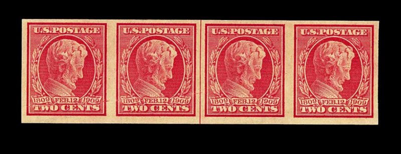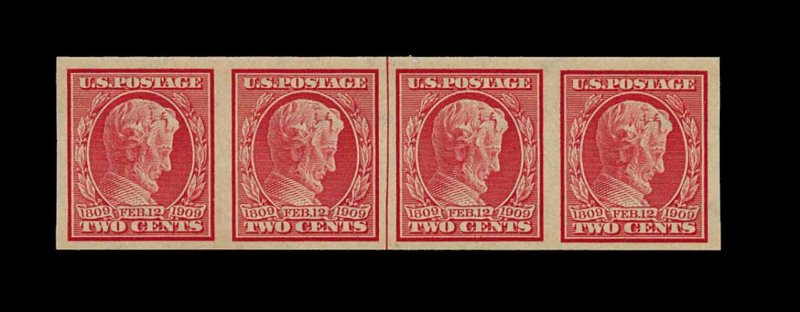 365 nh 368H image#368H, 2c Lincoln imperforate coil, horizontal format, another guide line strip of four, almost as choice as the previous lot, well centered and margined, deep rich color, o.g., n.h., choice very fine; 1991 PF certificate. (Image) Est. 500-750