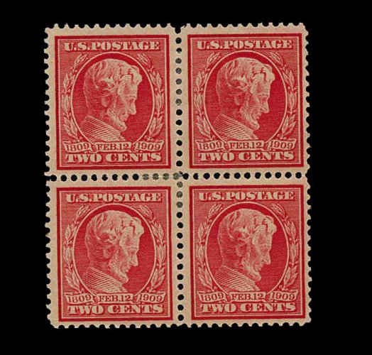 367 ogbl 369 image#369, 2c Lincoln on bluish paper, mint block of four with 3mm spacing, well centered (especially the top left stamp), strong color, o.g., minor h.r.'s, very fine. (Image) 950.00
