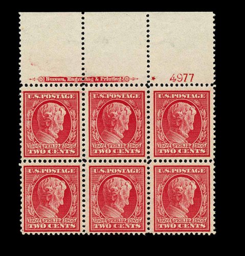368 nhX 369 image#369, 2c Lincoln on bluish paper, an especially handsome and choice full top margin imprint, small star and plate no. 4977 block of six, brilliantly fresh, sumptuously rich color and impression, well centered, pristine o.g., n.h., very fine; a desirable full top example of this very scarce commemorative plate block. (Image) 4,400.00