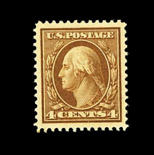 372 nh 377 image#377, 4c Brown, a striking mint single that is flawlessly centered within extravagantly large margins, strong color and impression, o.g., n.h., extremely fine; a most impressive gem; 2002 PF certificate. (Image) 57.50